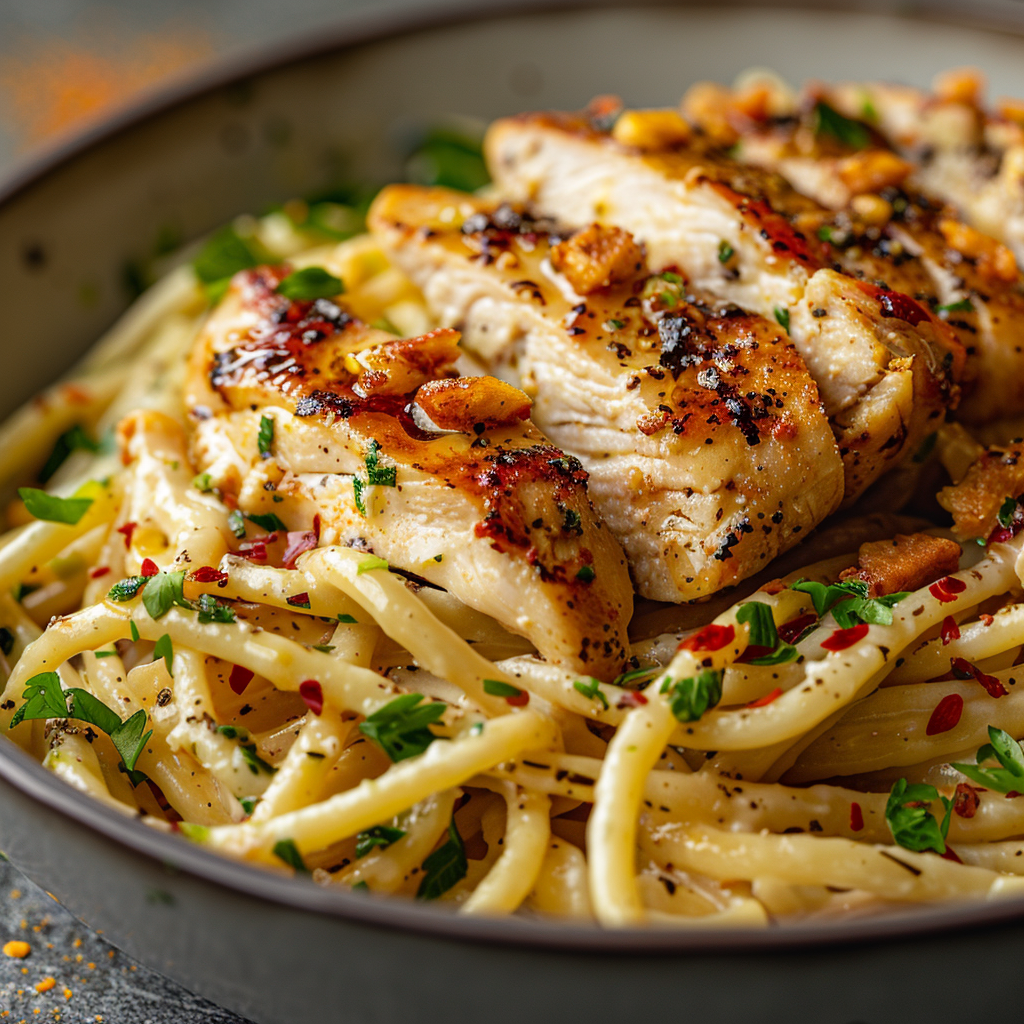 - Add cooked pasta and sliced chicken to the skillet. Toss to coat, adding reserved pasta water as needed for a silky sauce.